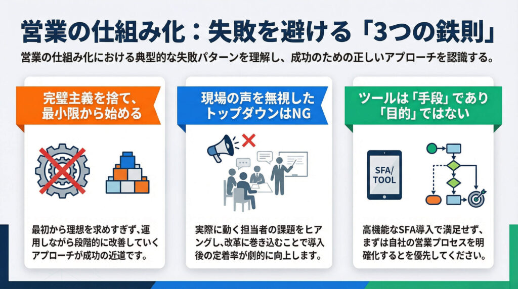 営業の仕組み化は多くの組織が目指すべき方向性ですが、その過程で陥りがちな失敗パターンがあります。実際、多くの営業改革プロジェクトが途中で頓挫したり、期待した成果を上げられなかったりする現実があります。ここでは、営業の仕組み化を進める際に特に注意すべき3つのポイントを解説します。