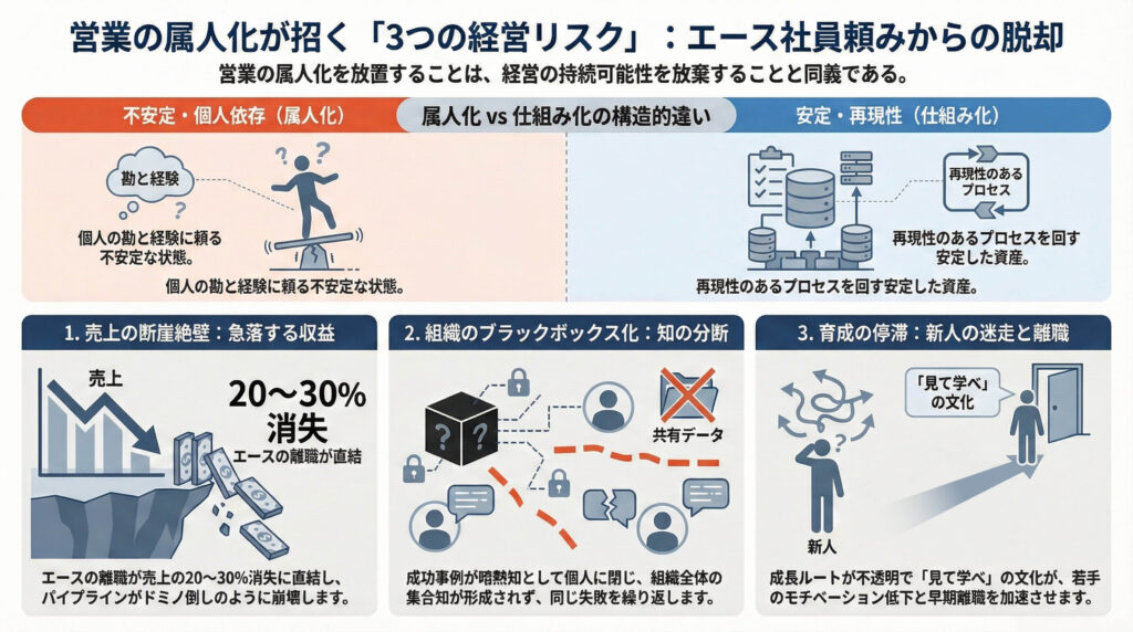 多くのB2B企業が直面するこの不安は、営業活動の「属人化」という根深い課題を示しています。特定の営業パーソンの個人的なスキル、人脈、経験に依存した営業体制は、一見効率的に見えても、組織としては極めて脆弱な状態です。